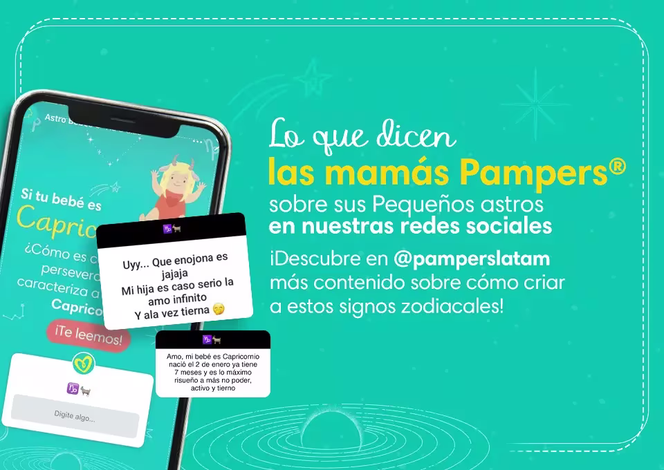 Si tu bebé es Capricornio, es posible que sea un pequeñito un poco ambicioso y disciplinado, por lo que quizá con los pañales Pampers® Baby Dry, que se adaptan suavemente alrededor de las piernas de tu bebé evitando los derrames; se sentirá seguro y cómodo.